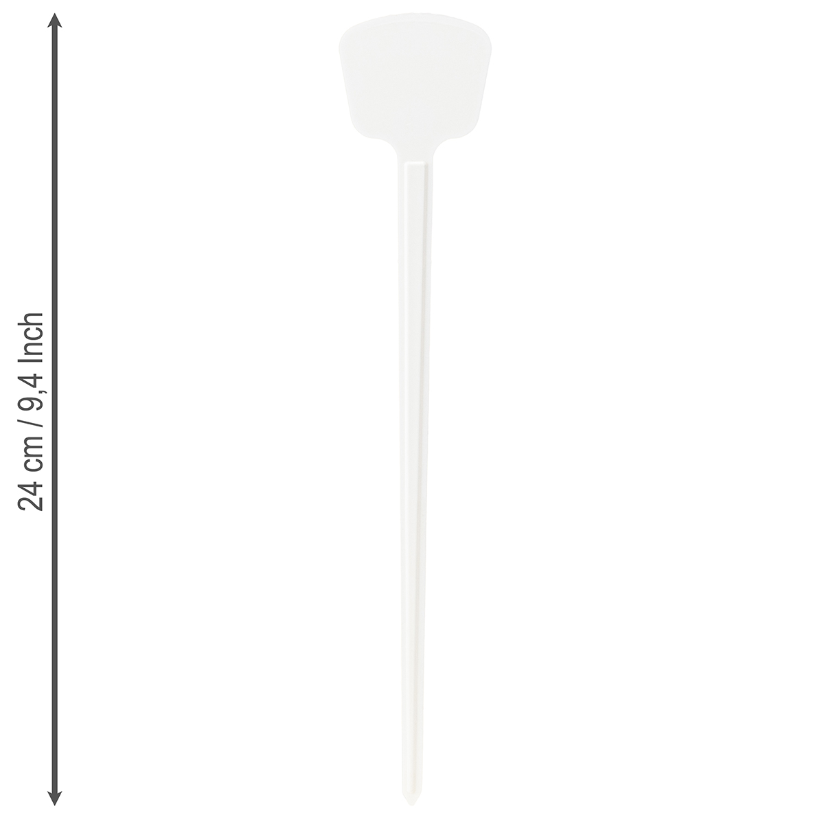 Växtstiftet kommer till dig i ett paket av 10. Varje växtpropp har en total längd på cirka 28 centimeter; stången är ungefär 24 centimeter lång, medan skyltarnas area mäter cirka 50 x 40 millimeter. Blomsterhandlare använder ofta planttillbehören som prislapp.