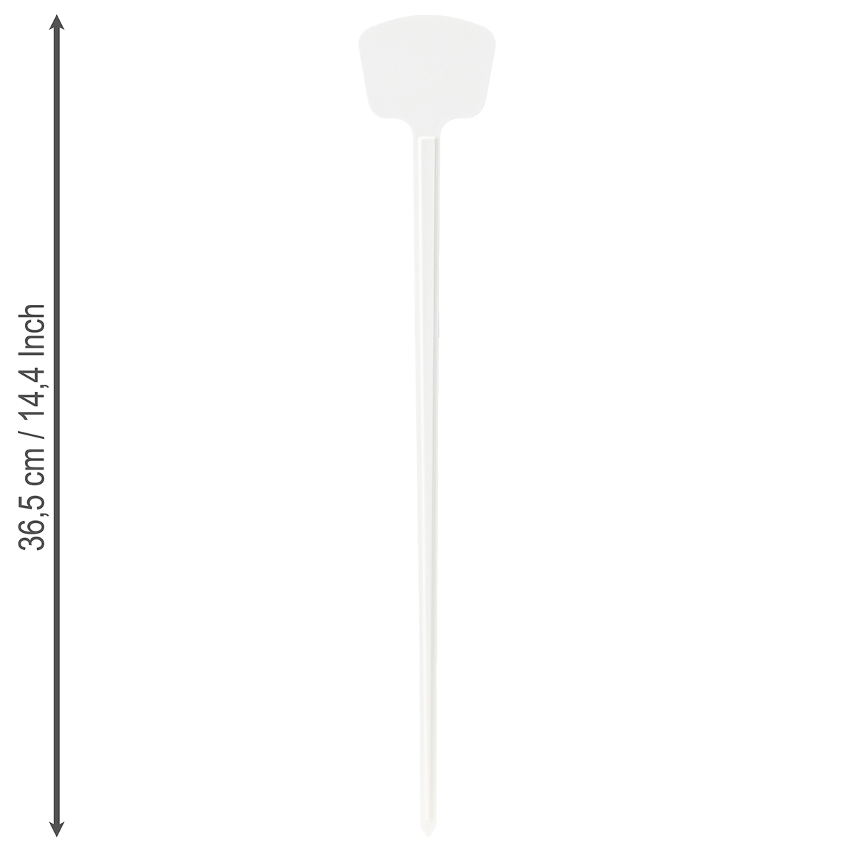 Växtstiftet har en stavlängd på cirka 32 centimeter och skyltområdet har en storlek på cirka 60 x 45 millimeter: Sammantaget är hela blomstiftet för märkning cirka 36,5 centimeter långt. Planteringstillbehören levereras i en förpackning med 10 stycken.