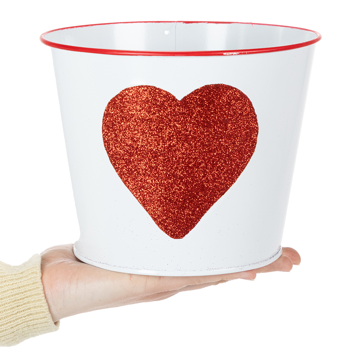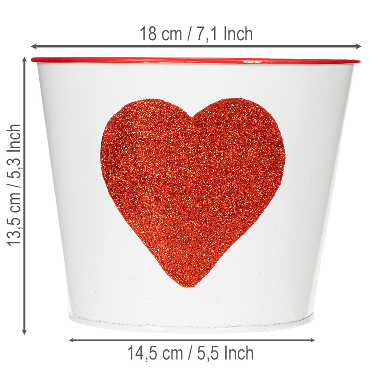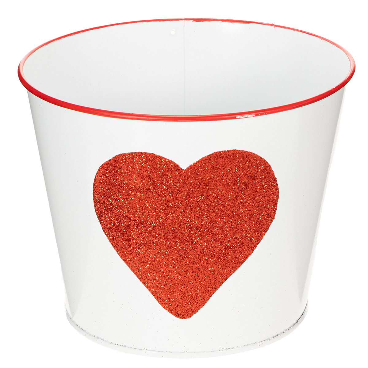 Denna blomkruka med den glittrande hjärtformen är den perfekta krukan för att skänka orkidéer på Alla hjärtans dag. Den vita plåthinken har ett väldigt romantiskt hjärta med rött glitter och en röd bård i mitten. Med en sådan klassisk design blir mamma också glad över en växt eller blomma till mors dag.